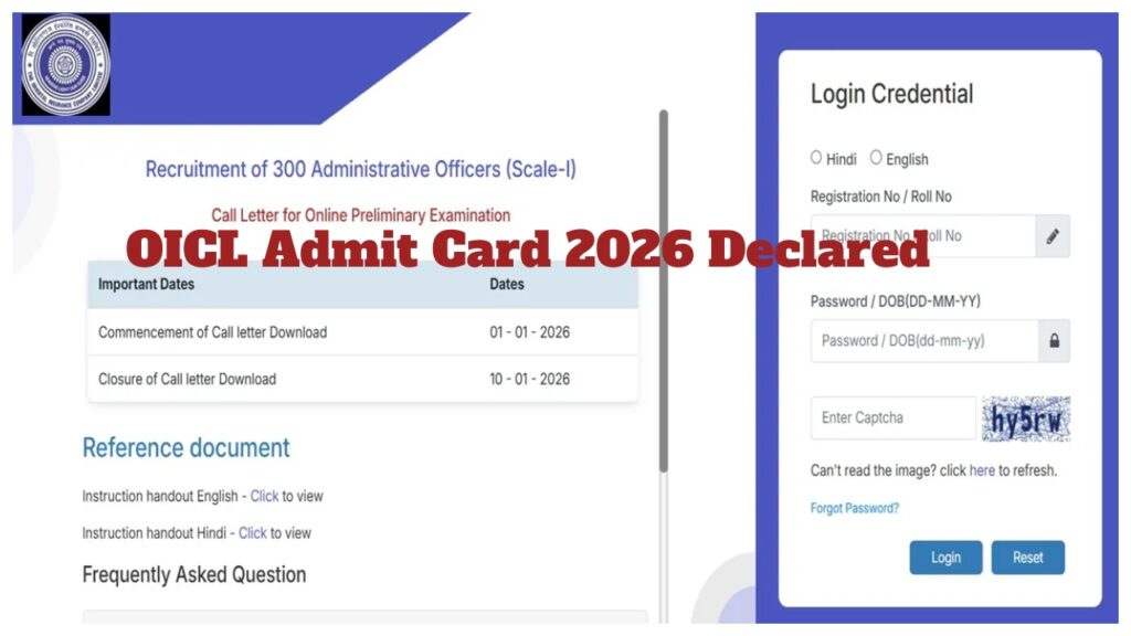 OICL Admit Card 2026 Declared: The Oriental Insurance Company Limited (OICL) has released the admit cards for the Administrative Officer Tier-1 examination. Candidates appearing for this exam can download their hall tickets from the official website. To download the admit card, candidates will need their registration number, password, and captcha code. The examination will be conducted at various test centres on January 10, 2026. There is not much time left before the exam. Candidates are advised to complete their final revision as soon as possible.