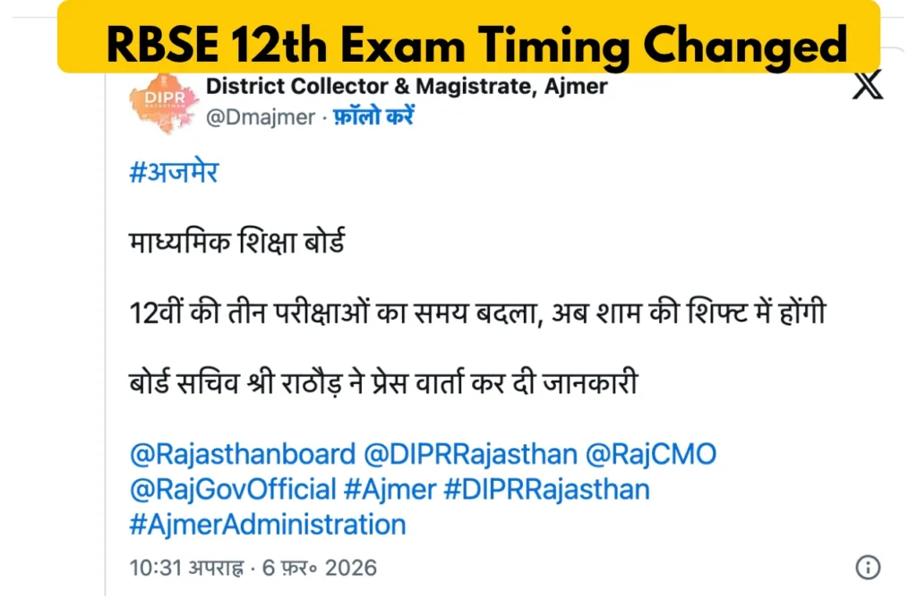 RBSE Rajasthan Board 12th Exam Time Table 2026: Big news is coming for Rajasthan Board Class 12th students. The Rajasthan Board of Secondary Education has changed the exam timings for three subjects in the 2026 Class 12th exams. Admit cards were recently released for Rajasthan Board students. All students appearing for the exam can download their admit cards from the official website using their school login details.