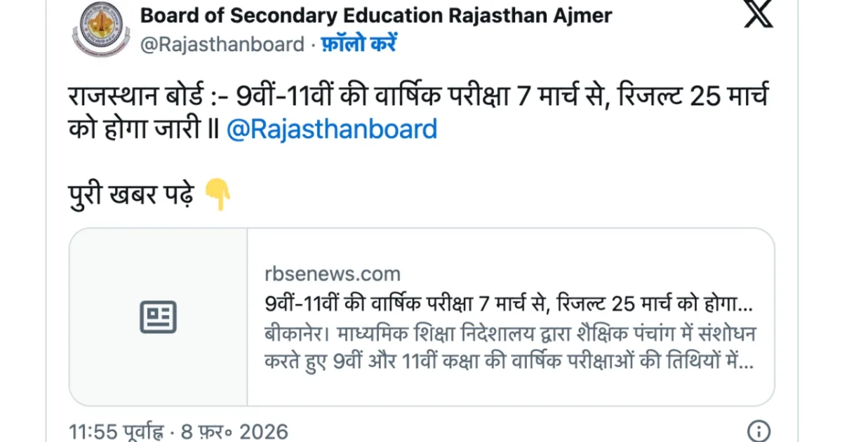 — Board of Secondary Education Rajasthan Ajmer (@Rajasthanboard) February 8, 2026