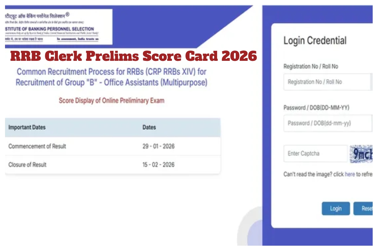 IBPS RRB Clerk Score Card 2026: The Institute of Banking Personnel Selection (IBPS) has released the scorecards for the Clerk preliminary examination. Candidates who appeared in this exam were eagerly awaiting their results. Now, candidates who participated in the RRB XIV (14th) examination can check and download their scorecards from the official IBPS website. The IBPS RRB Clerk exam results are available for download on the official website. Candidates can download their scorecards until February 15th, after which the download link will be removed. The examination was conducted on December 6th, 7th, 13th, and 14th, 2025. IBPS released the RRB Clerk preliminary results on January 23rd. Let’s find out how to download the IBPS RRB Clerk Score Card 2026 from the official website.