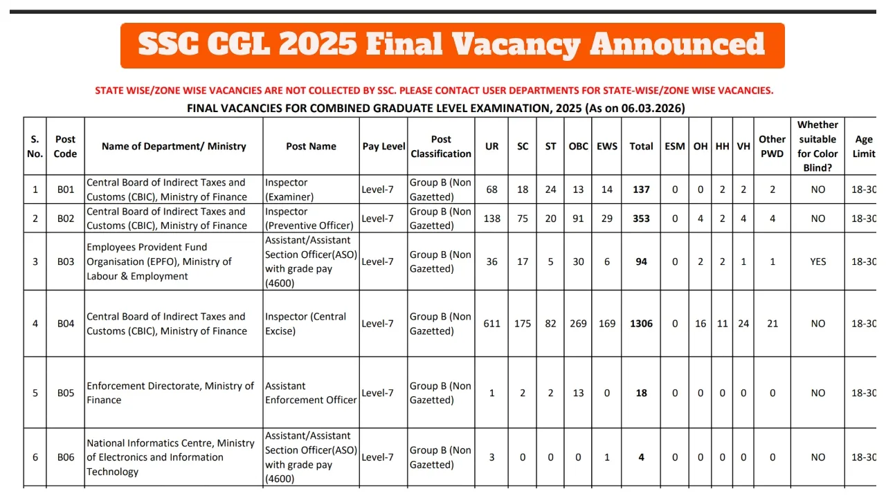 The Staff Selection Commission released the SSC CGL Final Vacancy 2025 in a detailed notice on March 6, 2026. The SSC CGL Exam 2025 follows a two-tier online selection process to assess candidates’ skills and abilitiesfor various central government posts.