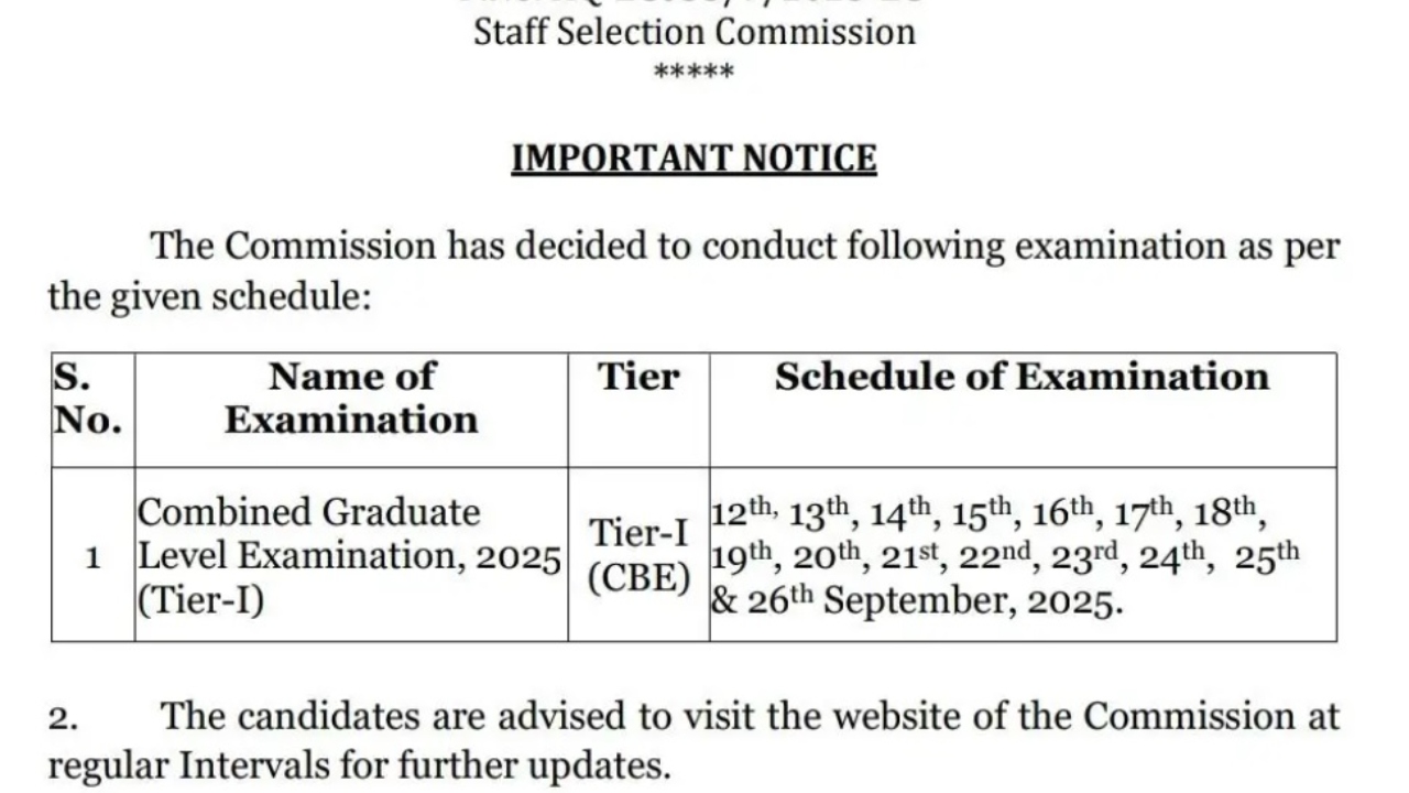 SSC will conduct the examination for a total of 15 days at the designated centres across the country. According to the schedule, the exam will be conducted on the following dates: 12, 13, 14, 15, 16, 17, 18, 19, 20, 21, 22, 23, 24, 25, and 26 September 2025.
