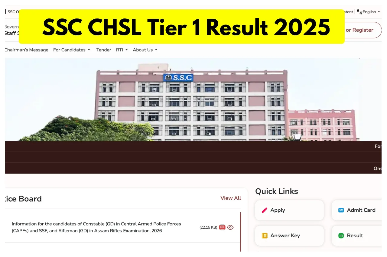 SSC CHSL Tier 1 Result 2025: The results of the Combined Higher Secondary Level Tier 1 exam conducted by the Staff Selection Commission are expected to be released very soon. Candidates who appeared for the SSC CHSL Tier 1 2025 exam are awaiting their results. It is being said that the SSC will release the results very soon. The Commission will make the CHSL Tier 1 exam results available for download on the official website, ssc.gov.in. Once the results are released, candidates can easily check their scores using their roll numbers.