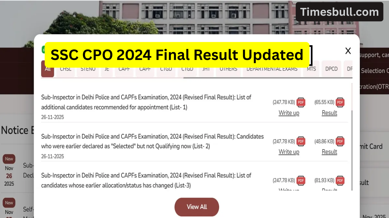 SSC CPO 2024 Final Result Updated. The Staff Selection Commission (SSC) has released the revised final result for the Delhi Police Sub-Inspector and CAPFs Recruitment 2024. Candidates can now download the updated merit list from the SSC’s official website, ssc.gov.in. The revised result includes candidates’ roll numbers, names, parents’ names, gender, category, and final rank.