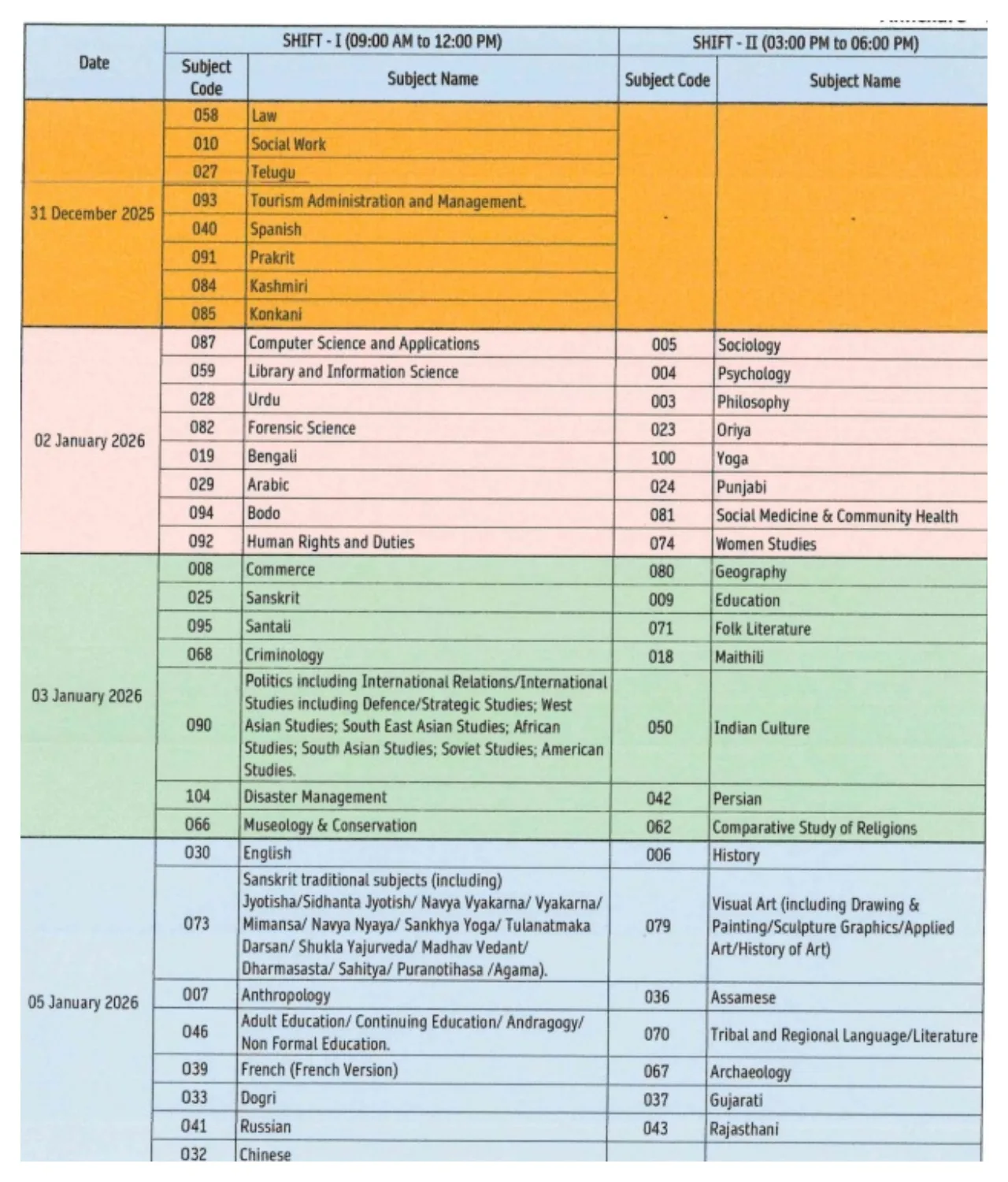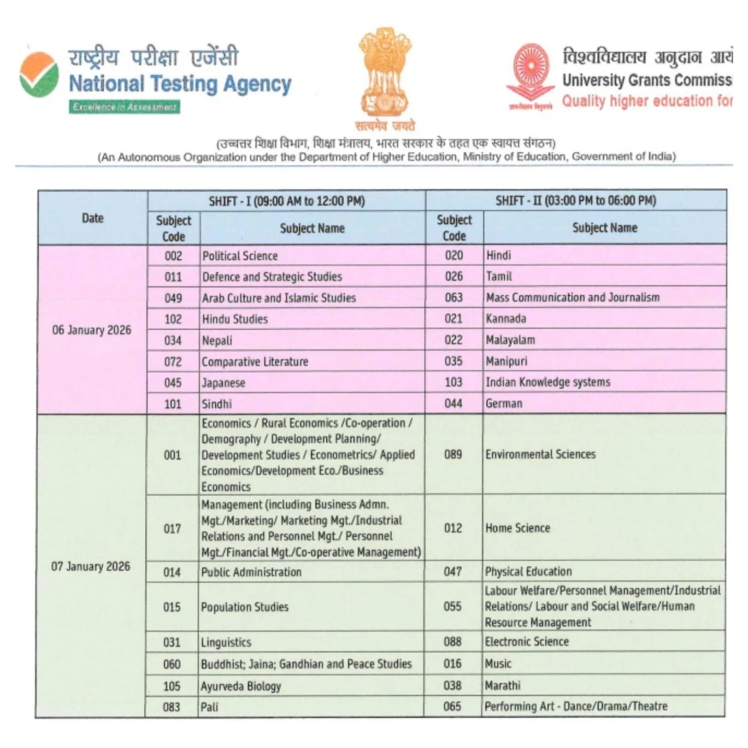 According to the notification issued by the NTA, the examination will be conducted on December 31, and January 2, 3, 5, 6, and 7, 2026. The exam will be held in two shifts. The first shift will be from 9 AM to 12 PM, and the second shift will be from 3 PM to 6 PM. You can see the shift and date information for each subject in the image below.