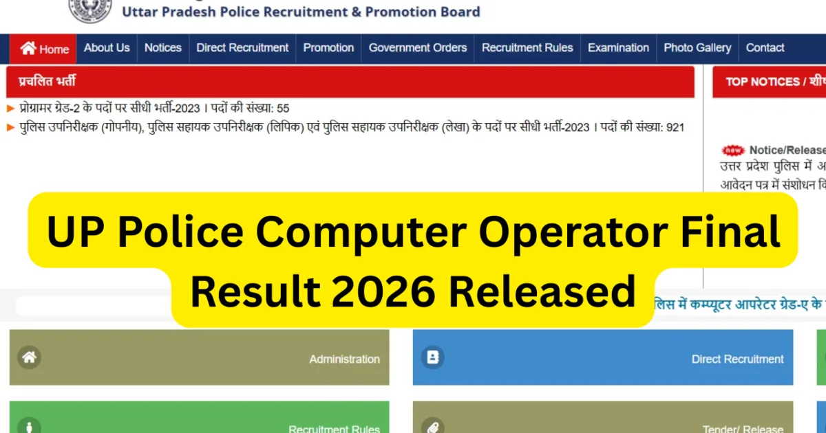UP Police Computer Operator Final Result 2026 Released : The Uttar Pradesh Police Recruitment and Promotion Board has released the UP Police Computer Operator Final Result 2026. All candidates who participated in the recruitment process can now check the complete final merit list. The result has been released in a PDF format which shows the roll numbers of candidates who were successfully selected.