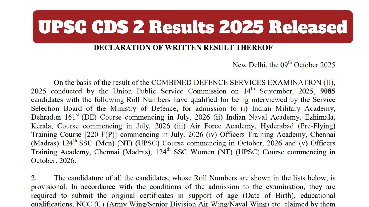 UPSC CDS 2 Results 2025 OUT: The Union Public Service Commission has declared the results of the Combined Defence Services Examination-II, 2025. Candidates who appeared in the examination can now check their results by visiting the Commission’s official website, upsc.gov.in. Candidates who have passed the written examination will now be called for the SSB interview. The results are available in a roll number-wise PDF format. Candidates can check their scores through the official website, upsc.gov.in, and download them for future reference.