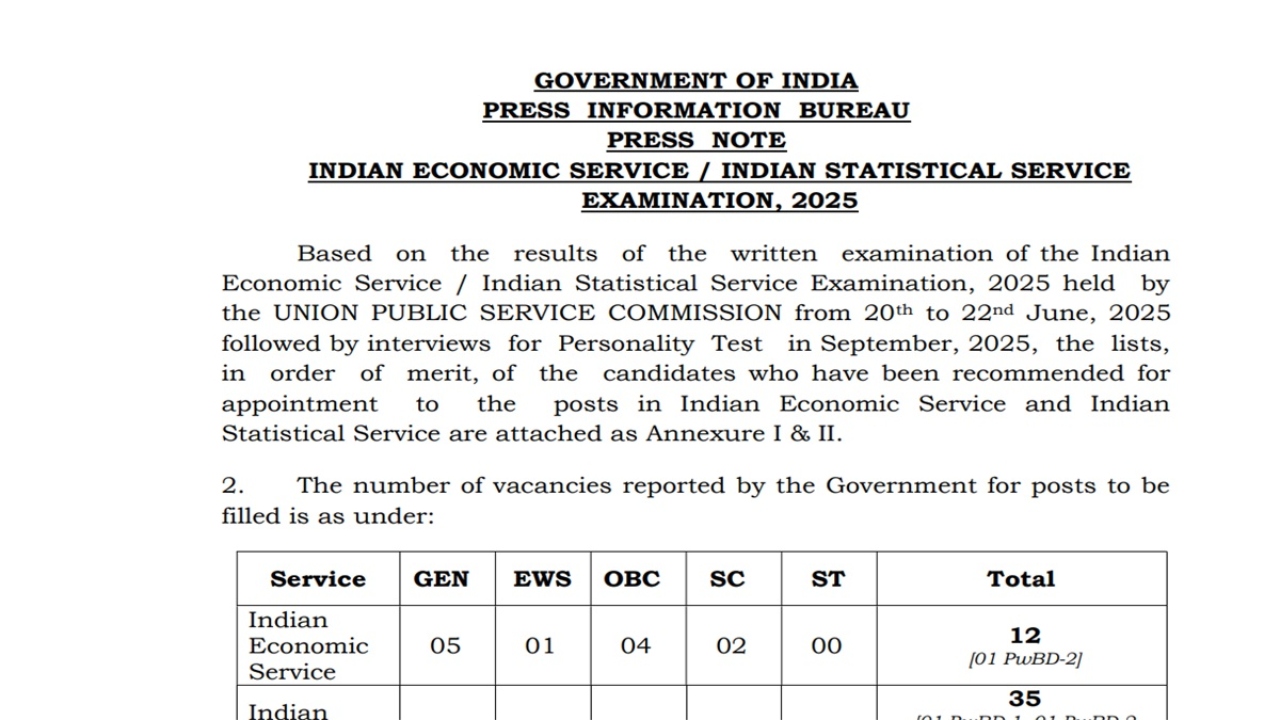 UPSC IES/ISS Final Result 2025: The Union Public Service Commission has released the final results for the Indian Economic Service (IES) and Indian Statistical Service (ISS) examinations. Candidates eagerly awaiting the UPSC IES/ISS Final Result can now check and download their scores through the official website, upsc.gov.in. The UPSC conducted the written examination for the selection of candidates from June 20 to June 22, 2025, while the interview was held in September. UPSC Chairman Ajay Kumar posted on ‘X’, expressing his heartfelt congratulations to the new IES and ISS officers.