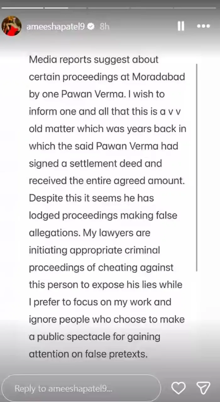 Ameesha expressed her views in a lengthy note on her Instagram story. She clearly stated that this was an attempt to defame her. Highlights of Ameesha’s statement: