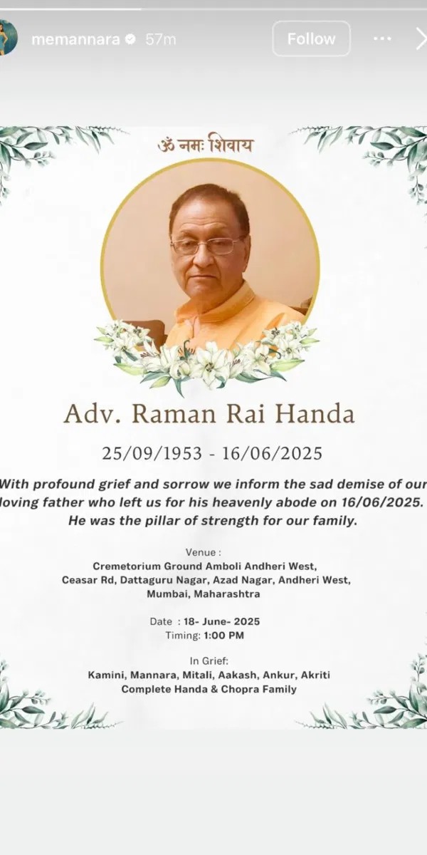 Mannara shared a picture of her father on her Instagram story and wrote a heart-touching message, “With great sorrow and sadness we have to inform that our beloved father passed away on 16 June 2025. He was a strong pillar of our family.” He further told that his father’s last rites will be held on 18 June 2025 at the Crematorium Ground in Amboli, Andheri West, Mumbai.