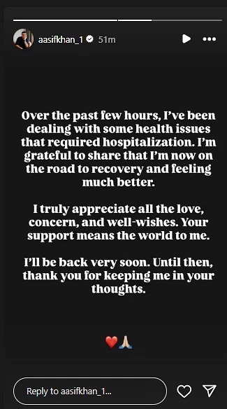 Asif Khan wrote in his note, ‘In the last 36 hours, I realized that anything can happen in life. Life should not be taken lightly at all. Always be grateful for life. ‘ He further emphasized that we should always keep our loved ones with us. ‘Remember who is important to you in life and always keep them with you. Life is a gift and always cherish it. ‘