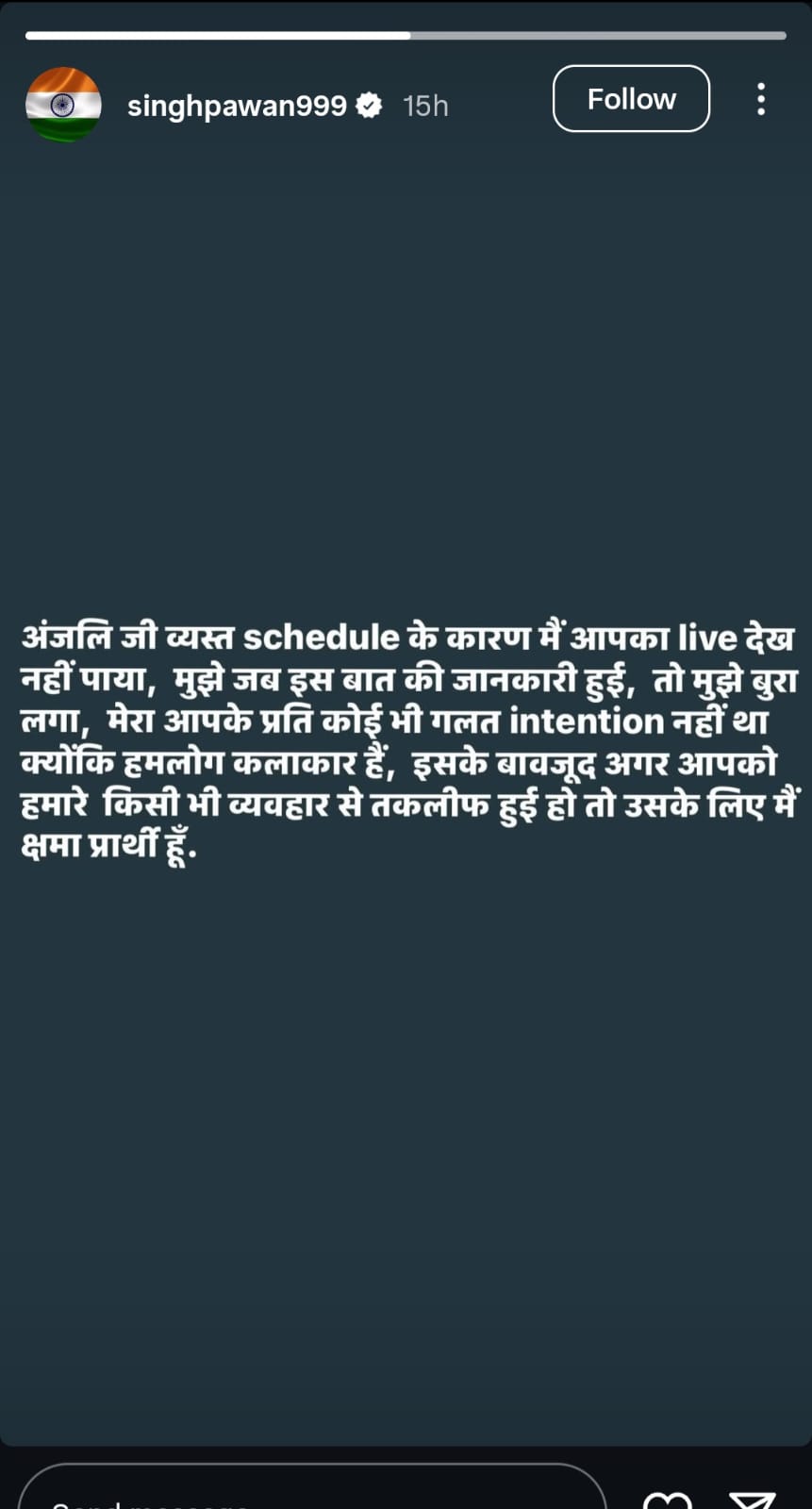 After the video went viral, Pawan Singh broke his silence on the matter and apologized to Anjali Raghav through a post on social media. He wrote on his Instagram story that he had no wrong intention and if his behavior has hurt Anjali, then he apologizes for that.