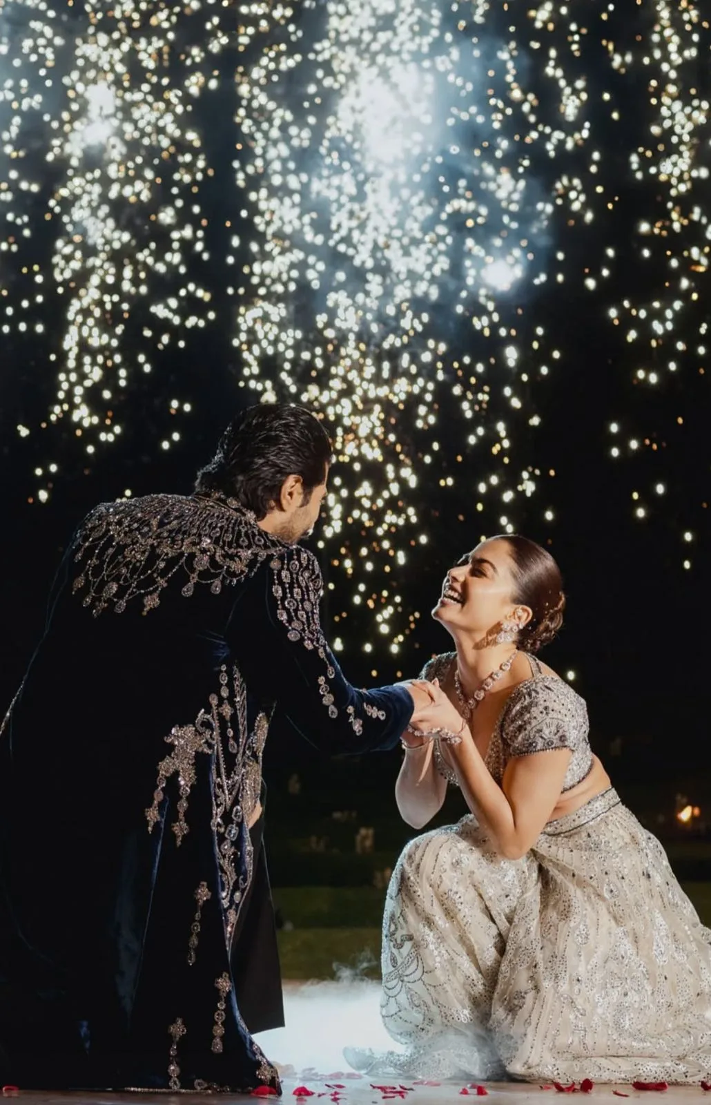 For the sangeet night, the power couple chose custom-made outfits by renowned designer duo Falguni Shane Peacock. She looked like an angel in a heavy silver outfit. Vijay wore a black star-studded outfit that caught everyone’s attention. Both of them added a long cape to their look, adding a royal touch to their entry.