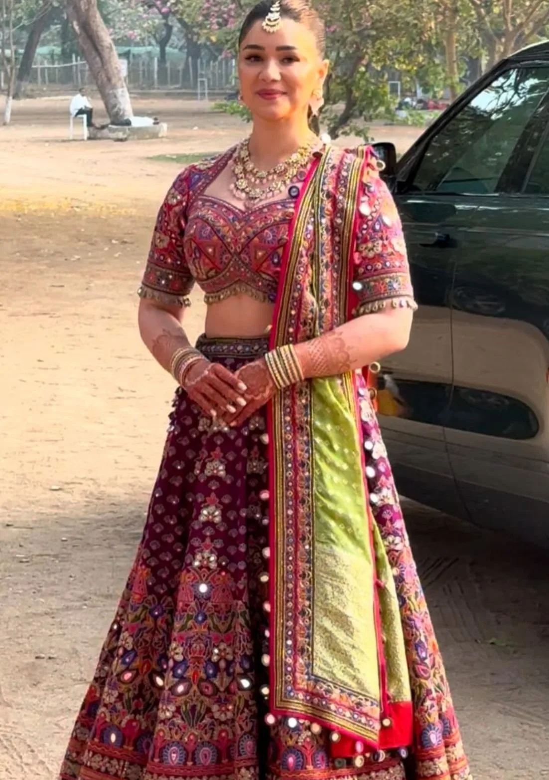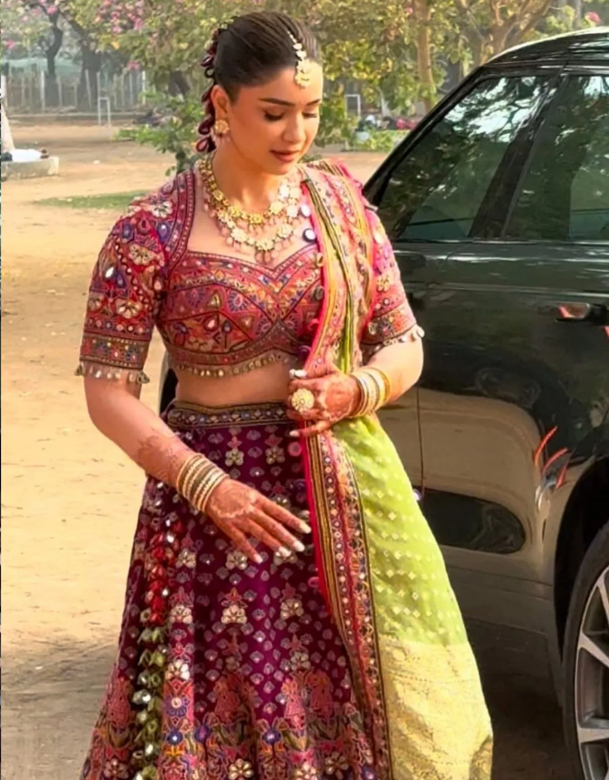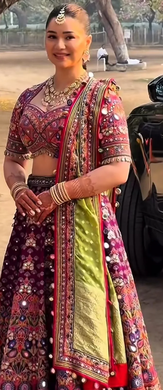 Sara chose a multi-color Bandhani lehenga designed by renowned fashion designer Arpita Mehta for this special occasion. A beautiful combination of purple and pink.  The lehenga features intricate mirror work, giving it a very royal look.  In contrast to the lehenga, she wore a pistachio green Bandhani dupatta, the tassels of which added to the overall look.