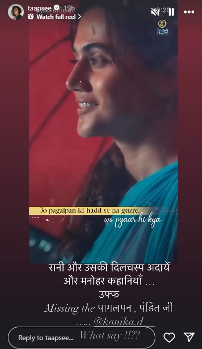 Taapsee Pannu recently shared a scene from ‘Phir Aayi Haseen Dilruba’ on her Instagram story. Tagging writer Kanika Dhillon, she wrote –