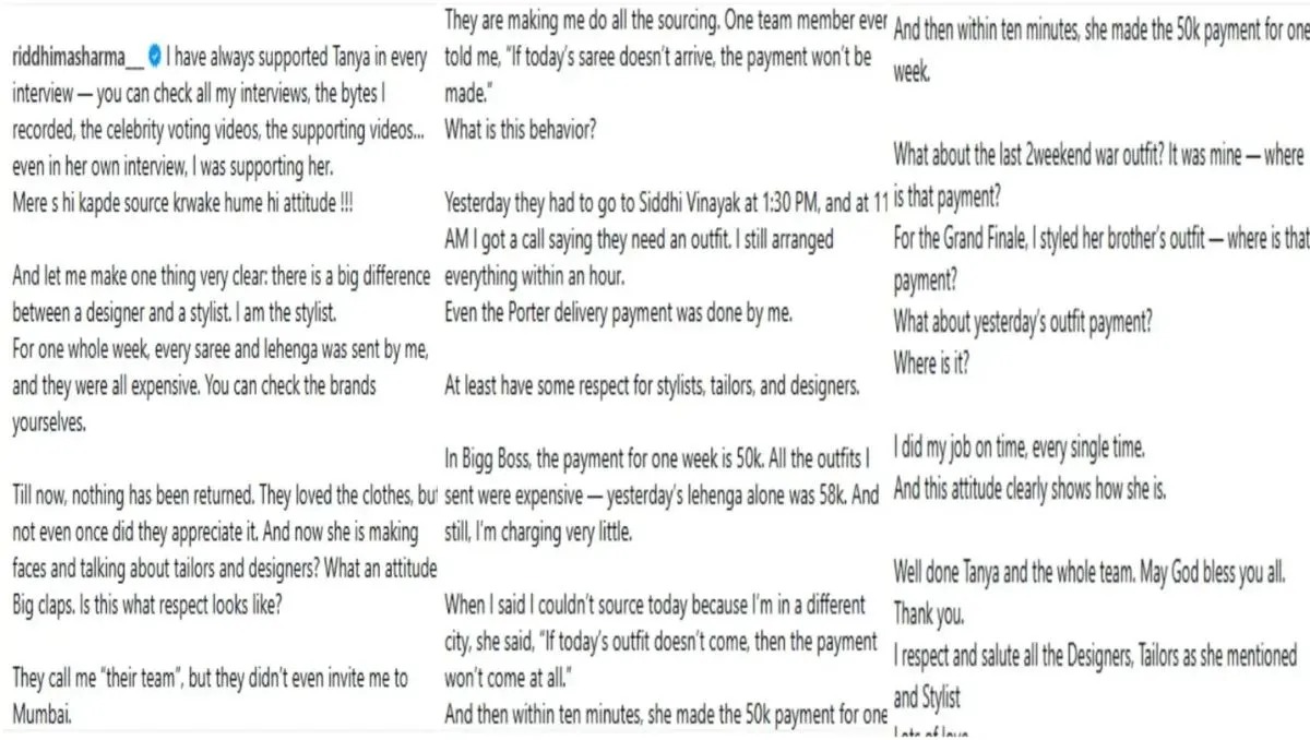 Riddhima, becoming emotional, wrote, “I always supported Tanya in every interview, even supporting her in voting for the Bigg Boss house. I sent her lehengas and sarees for a week, but nothing has been returned yet.” Riddhima’s sharp question: “She liked the clothes, but not once did I receive a compliment. She calls me her team, but never even invited me to Mumbai. She’s making me do all the work.”