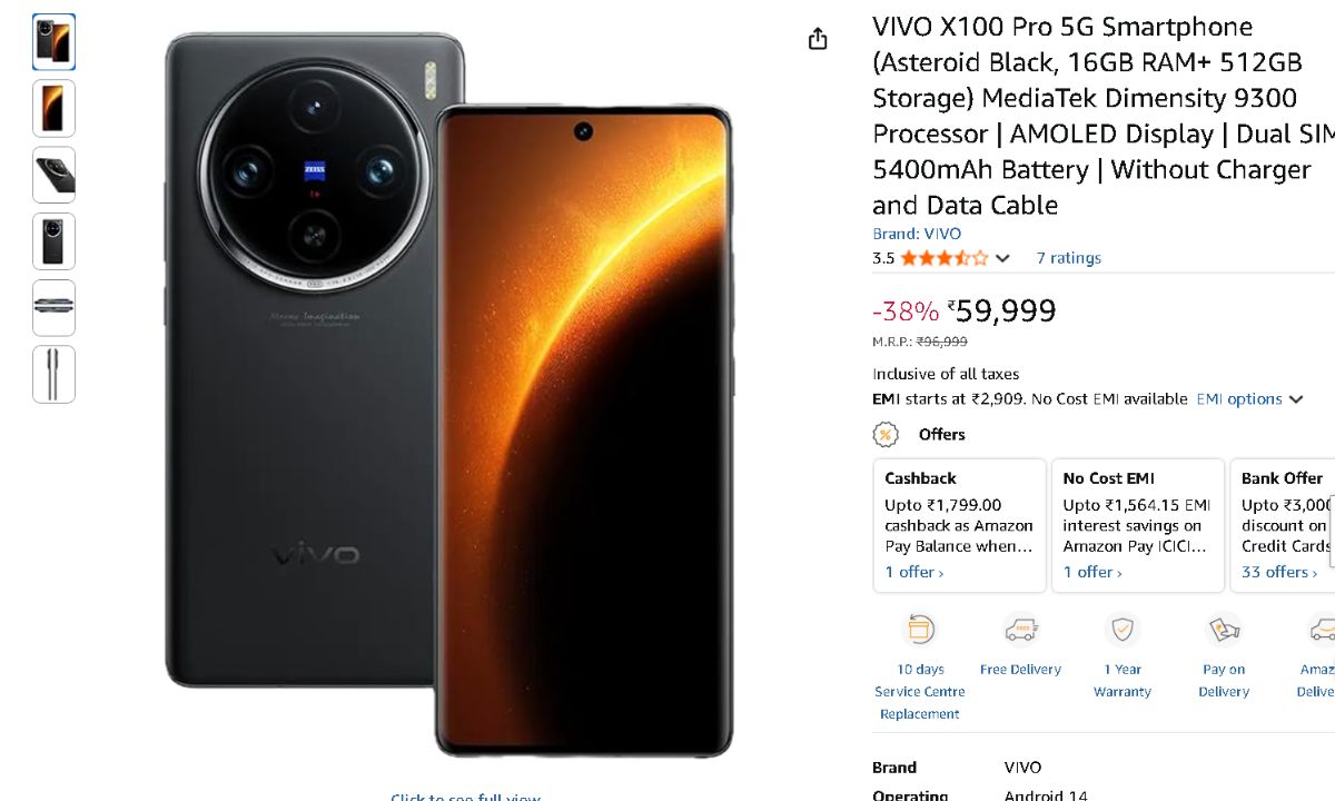 The Vivo X100 Pro is available on Amazon for ₹59,999, but its original price was ₹96,999. Also, you will save an extra ₹1,500 if you pay with an HDFC Bank credit card, lowering the total cost to ₹58,490. By exchanging in your old phone, you can also receive an exchange incentive of up to ₹44,150.In addition, Amazon is providing a free EMI option for this item, which makes it simple to buy it in installments.