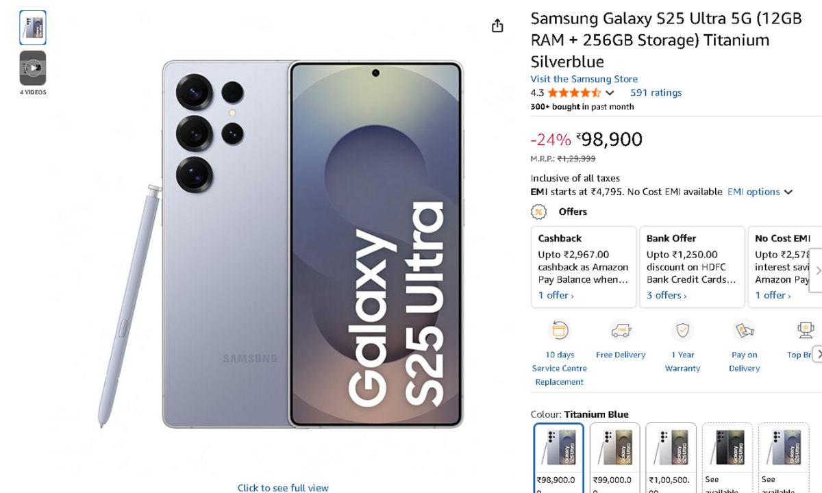 The Galaxy S25 Ultra’s Amazon listing price of ₹99,200 is significantly less than what it originally cost. An extra ₹1,250 bank discount is yours if you pay using an HDFC Bank card. This results in one of the lowest prices ever for the phone, at about ₹98,000.
