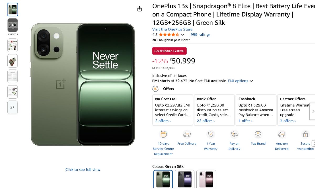 When the OnePlus 13s was first released in India, it priced Rs 54,999. This phone is presently for sale on Amazon for Rs 50,999. This indicates that the e-commerce site is giving the OnePlus 13 a flat discount of Rs 4,000. Also, you can receive an extra Rs 3,250 off of EMI buys for credit cards from Axis Bank, HDFC Bank, ICICI Bank, and RBL Bank.
