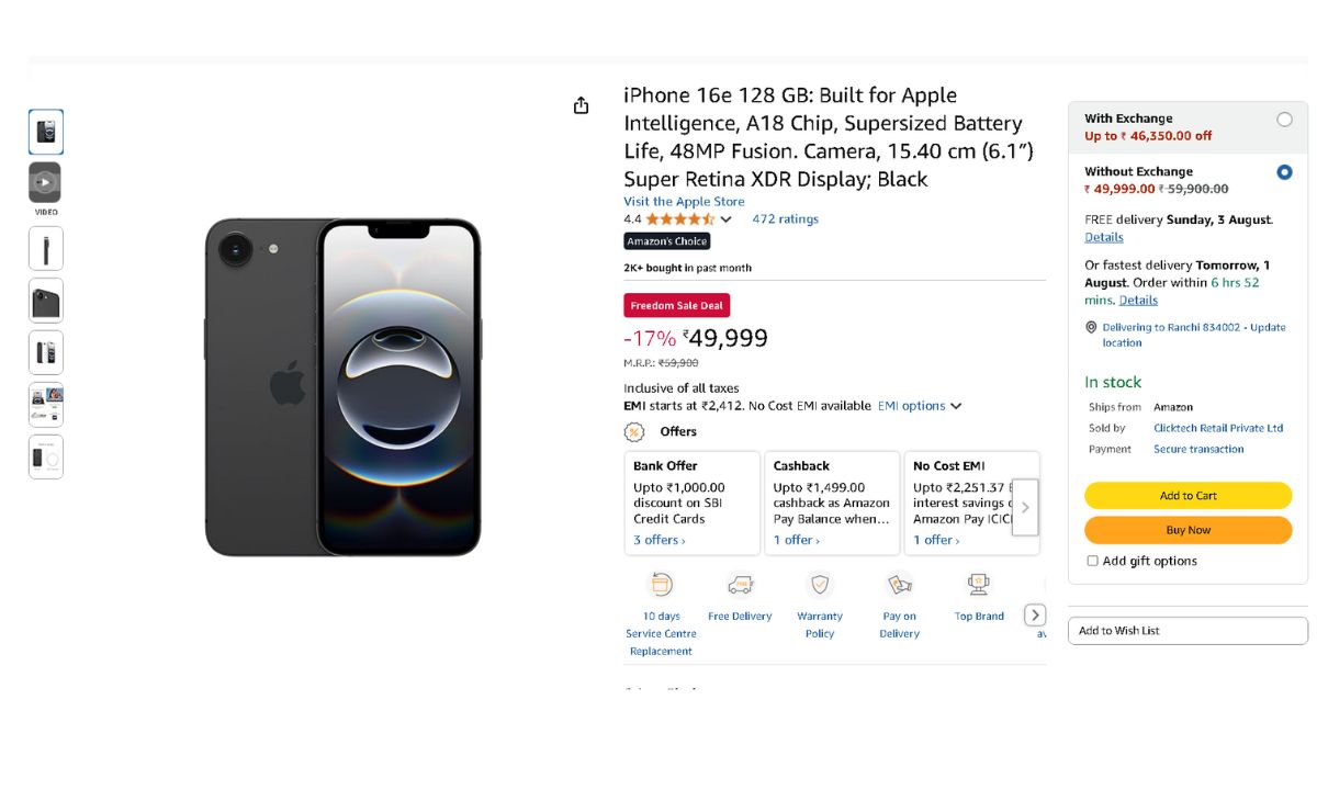 Let me start by informing you that the iPhone 16e, which retails for Rs 59,900, has been launched. But it is featured for Rs 49,999 in Amazon’s Great Freedom Festival Sale. Also, you can take advantage of bank and exchange discounts to buy it for less money.