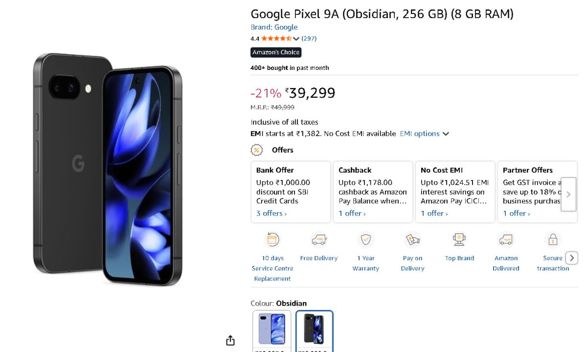 Currently priced at ₹39,899 on Amazon, the Google Pixel 9a (Porcelain, 256 GB) with 8 GB RAM is ₹11,100 less than its debut price of ₹49,999. A further discount of up to ₹1,000 is available to those who use an SBI credit card, substantially lowering the effective price. Also, the e-commerce portal provides a free EMI option.