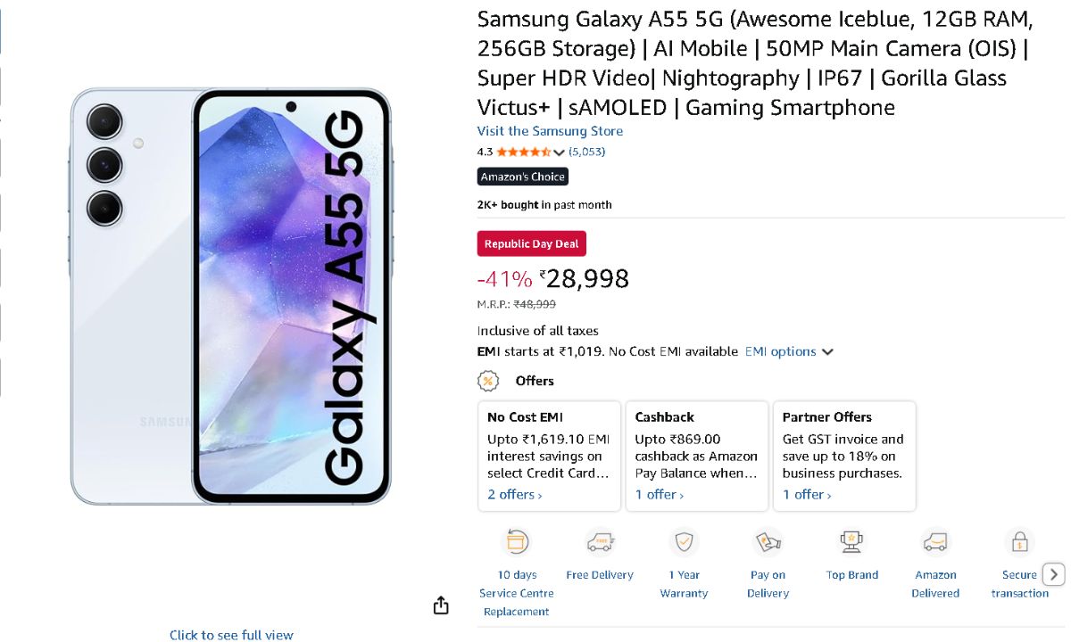Amazon Great Republic Day Sale: The premium version of the Samsung Galaxy A55 5G is discounted from its original price by Rs 17,000. A phone payback incentive of up to Rs 1449 is added in the a raise. With an exchange offer, you can buy this phone for even less money.
