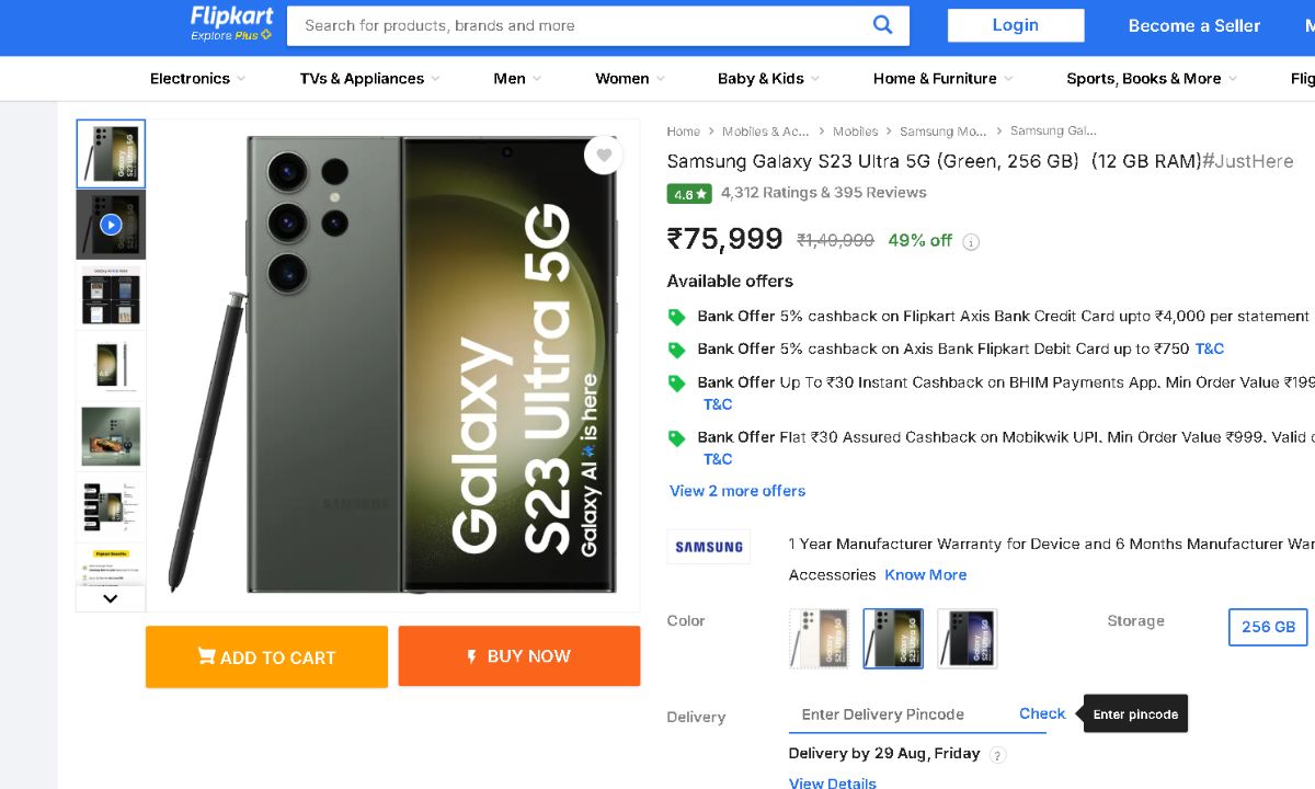 Flipkart prices the Samsung Galaxy S23 Ultra 5G.