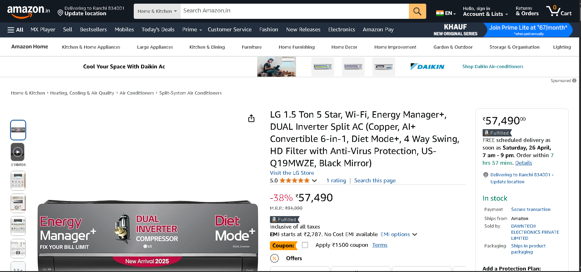Energy Manager+, Wi-Fi, DUAL Inverter Split AC, LG 1.5 Ton, 5 Star, Rs 57,490