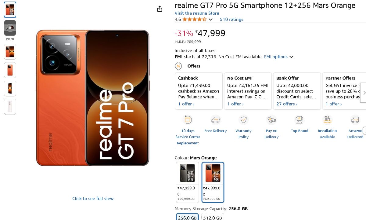 Last year, Realme let go the Realme GT 7 Pro, India’s first smartphone with an underwater camera mode. The phone model with 12 GB of RAM and 256 GB of internal storage priced Rs 59999 when it first hit the market. This phone is currently priced at Rs 50,998 on Amazon. In other words, the initial price of this phone has been reduced by Rs 9001. The unique aspect is that a Rs 2,000 coupon discount is also offered over the phone. The entire phone discount with this discount is Rs 9001 + 2000, or Rs 11001.