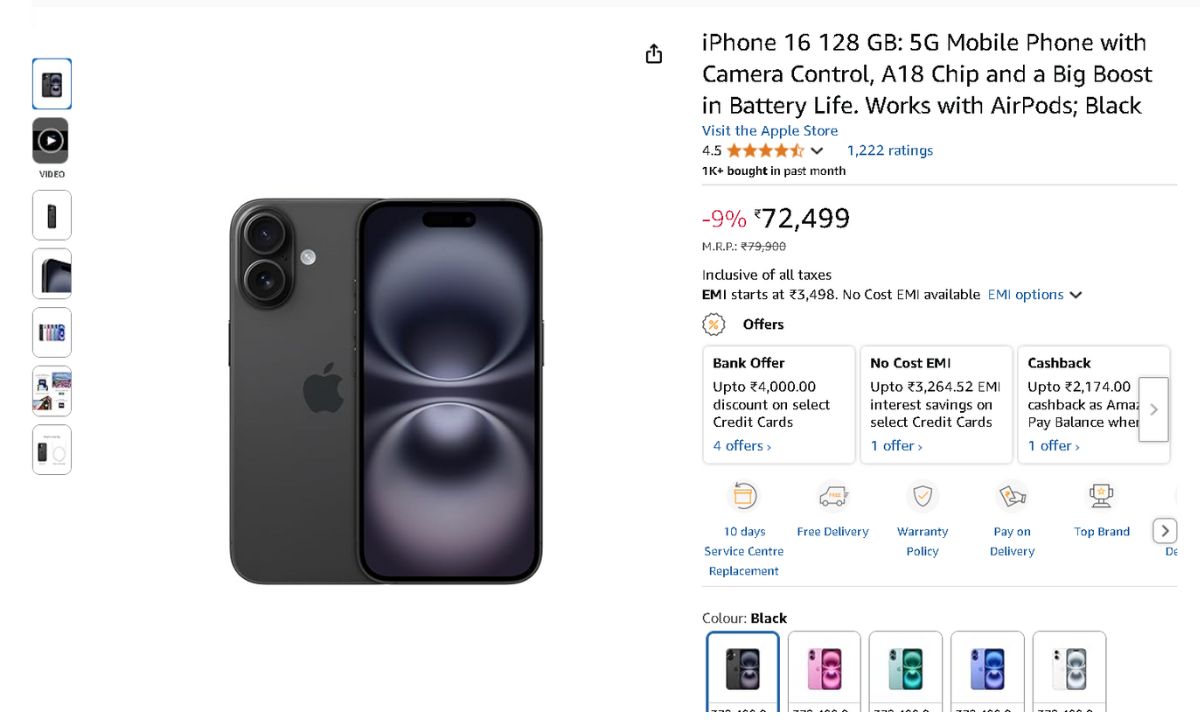 In addition, bank offers can allow you to save more money. Amazon is giving some bank cards an instant discount of up to Rs 4000. Also, you have a chance to receive over Rs 2100 in cashback at the moment of purchase. Amazon is also offering you the opportunity to buy the iPhone 16 on EMI if your budget is still tight.