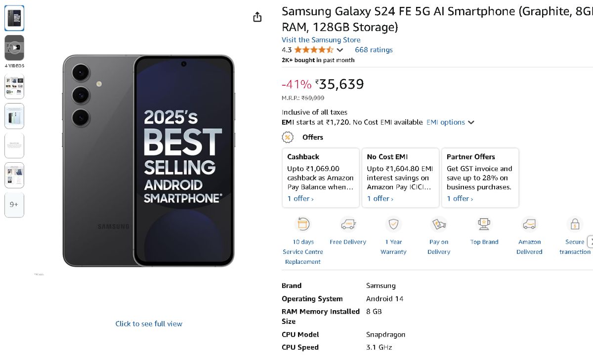 Samsung Galaxy S24 FE price on Amazon