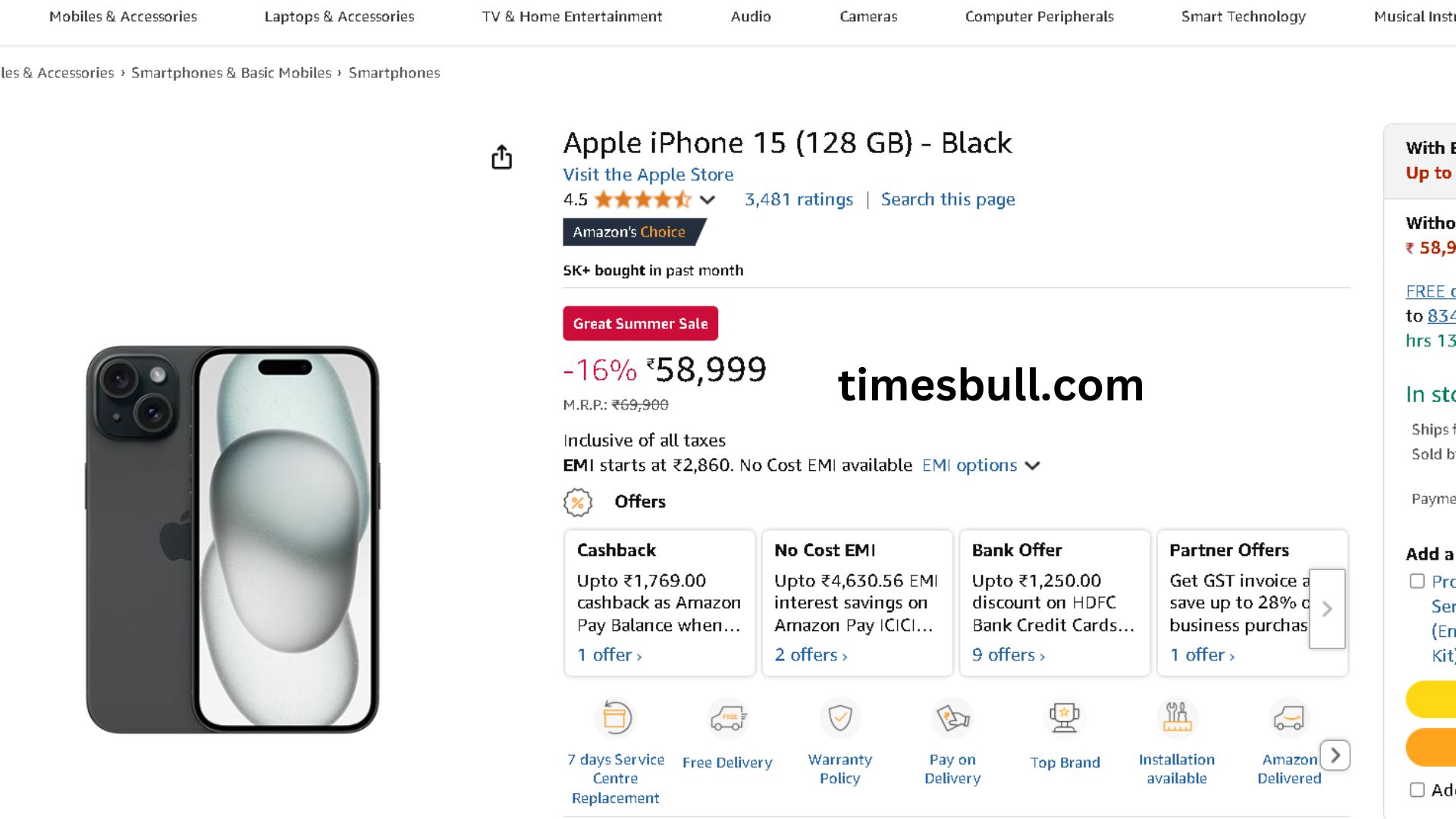 You can receive additional benefits if you are an HDFC Bank customer. You will also receive an additional Rs 1,750 off your iPhone purchase when you use this bank’s credit card. A Rs 1,250 discount is yours if you have a debit card. The iPhone 15 will be discounted by Rs 12,750, including the maximum bank discount, making its effective selling price Rs 57,249. In addition, the bank deal allows iPhones to be purchased on a free EMI plan.