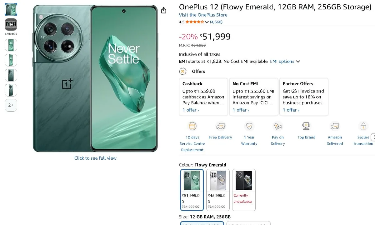 Two distinct versions of the OnePlus 12 based on RAM and storage have been released in India. The 12GB RAM + 256GB storage and 16GB RAM + 512GB storage models were priced at ₹64,999 and ₹69,999, respectively, at launch. It initially came in the colors Silky Black and Flowy Emerald. Glacial White was later added to the lineup by the firm. The current price of this phone is ₹19,000 cheaper. Let us examine the source of this phone’s low price.