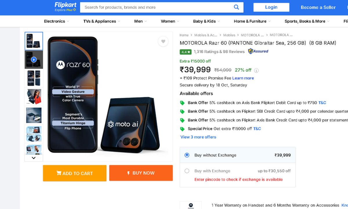 This Motorola device was launched by the company at ₹49,999. But for just ₹39,999, you can now buy this flip-style folding gadget from Flipkart. This shows a flat discount of up to ₹10,000 is being offered by the e-commerce giant. Also, there is a fantastic exchange offer that lowers the price considerably. By trading in your old phone, you can receive a decent deal.