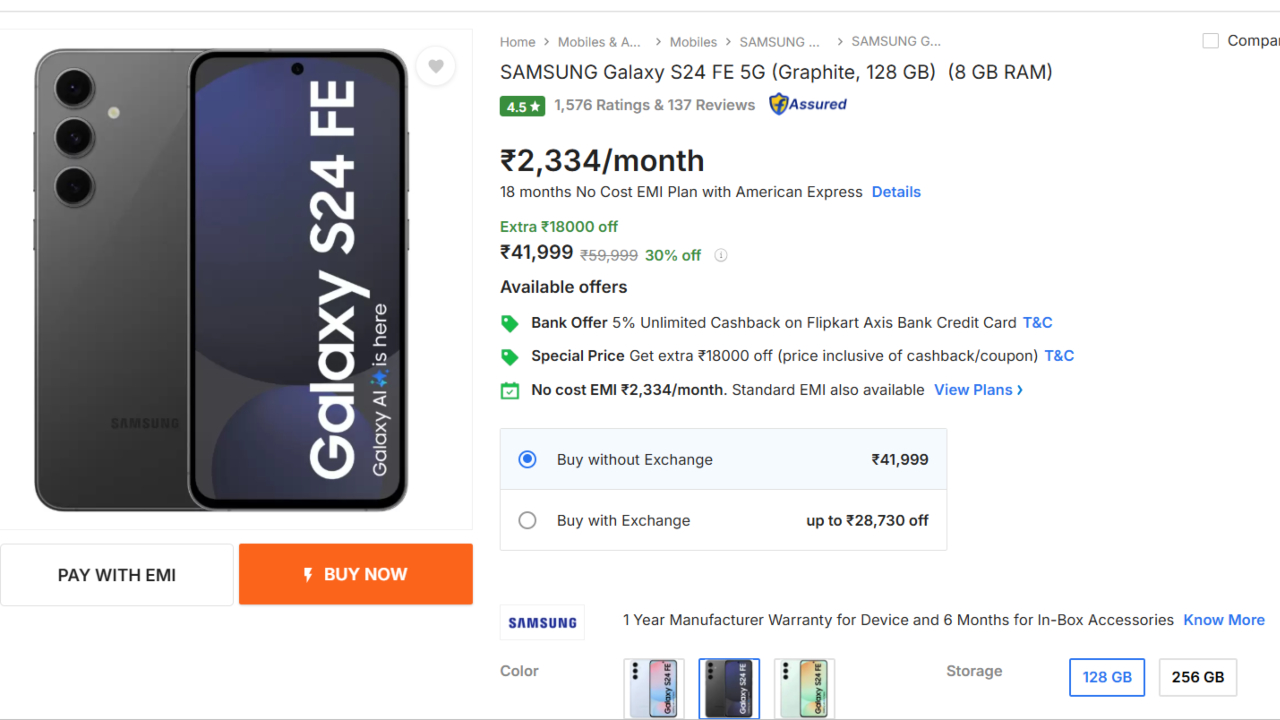 Samsung Galaxy S24 FE 5G : If you’ve been looking for a flagship phone but were waiting for the appropriate time today is the day. The Samsung Galaxy S24 FE 5G can be bought for a whopping 30% off on Amazon, and it is one of the best premium smartphone offers until now. The phone which was previously priced at Rs 59,999 is now reaching your home today at a minimum of Rs 41,999, so that’s a staggering Rs 18,000 flat off.