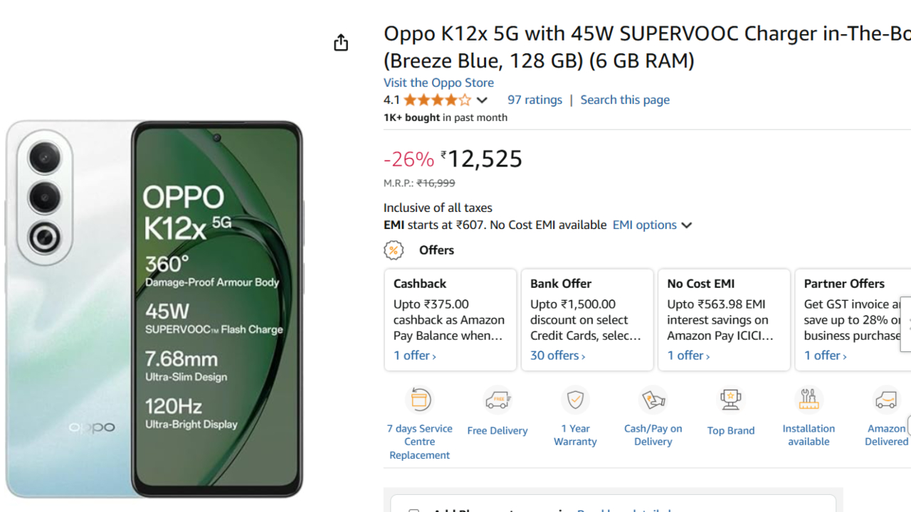 The market price of Oppo K12x 5G is Rs. 16,999. But here you can get it for just Rs. 12,480 in this deal. So you are getting discount of 27 percent right away. And if you want to pay by installment, no cost EMI facility is also there. So you can pay by installment without spending a single rupee extra.