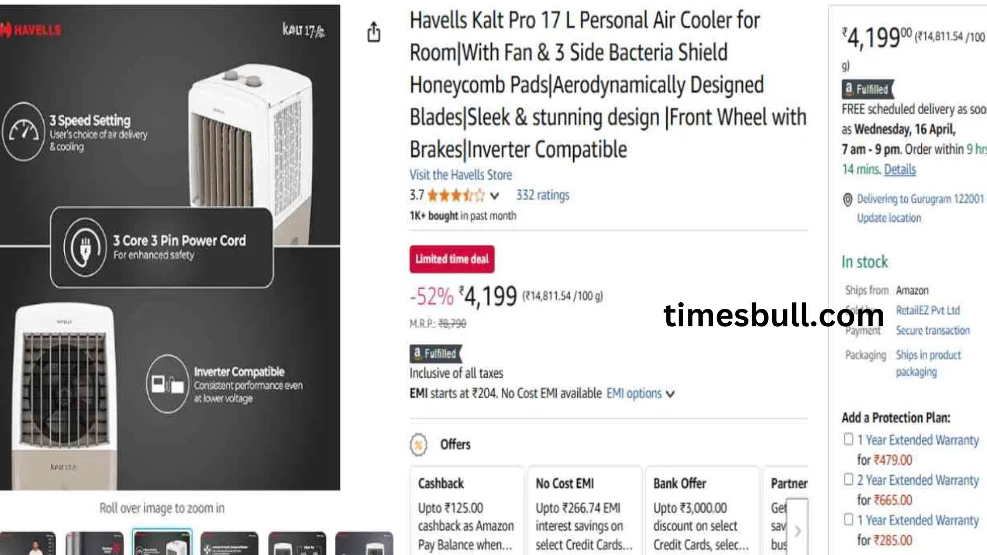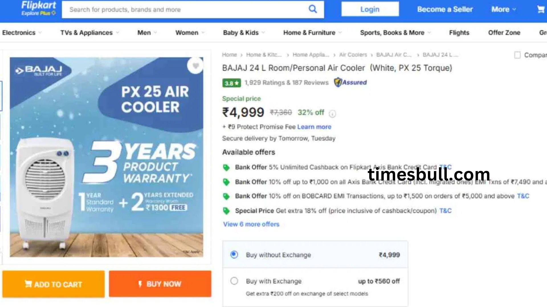 After a 32% discount, this 24-liter Bajaj air cooler is priced at Rs 4,999 on Flipkart. The supplier is offering a free one-year standard warranty and a two-year extended warranty with this cooler.