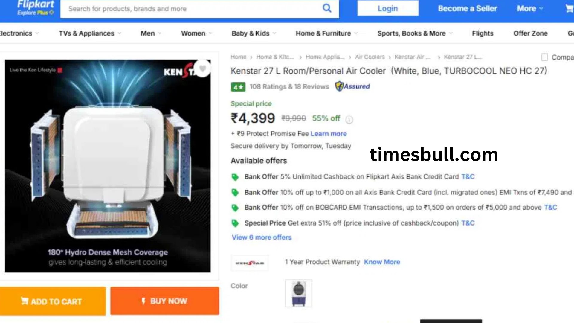 With a 55 percent discount, this 27-liter storage air cooler is available on Flipkart for Rs 4399. This cooler features a 12-inch large, powerful fan, a heavy-duty motor, and honeycomb pads. It comes with a one-year product warranty.