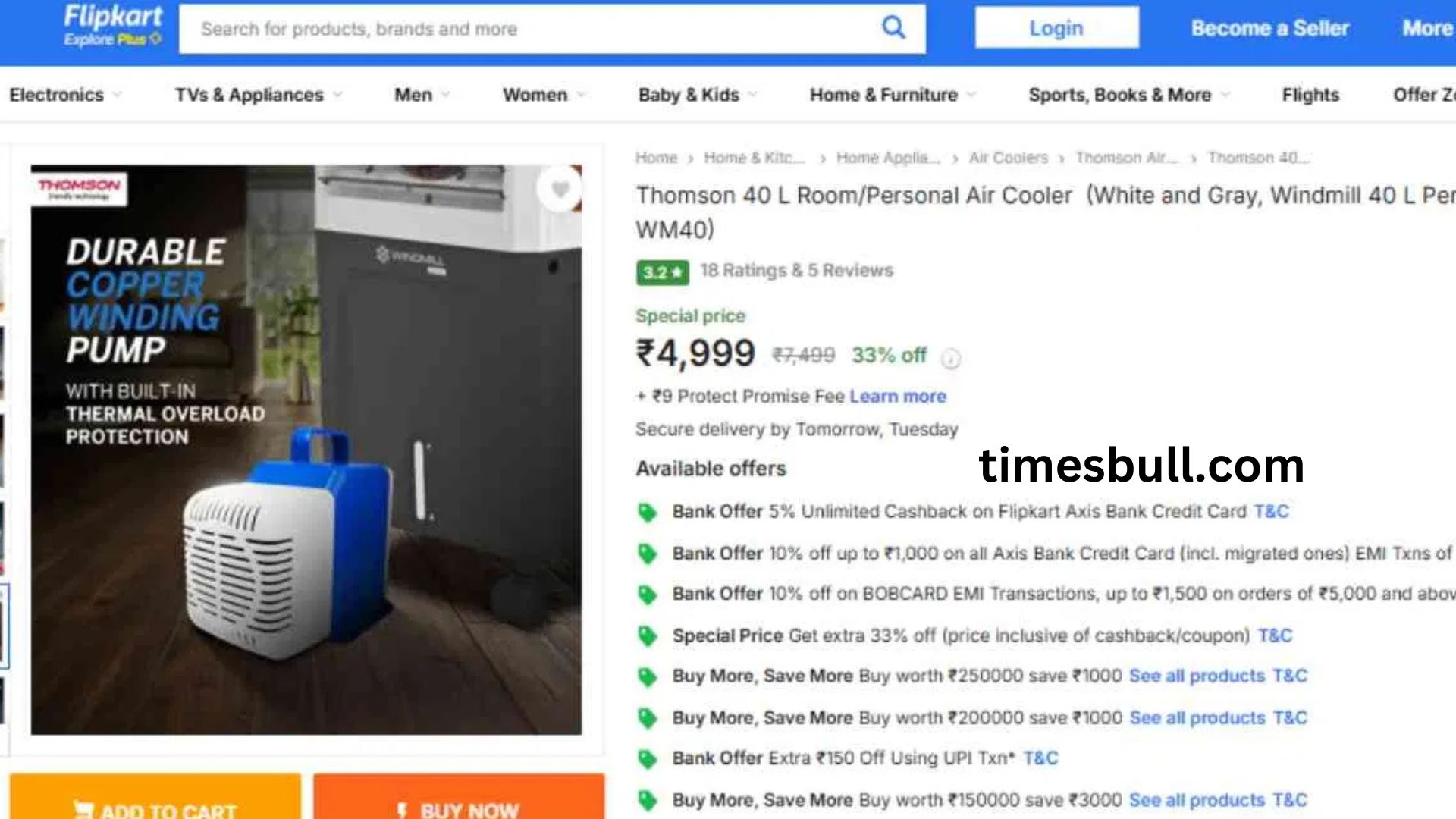 After a 33 percent discount, this air cooler from the Thomson firm with a 40-liter storage tank is available on Flipkart for Rs 4,999. The unique feature of this cooler is its inverter compatibility, which means it can operate with ease on an inverter as well. Also, this powerful motor cooler features wheels and honeycomb pads that make moving the cooler simple.