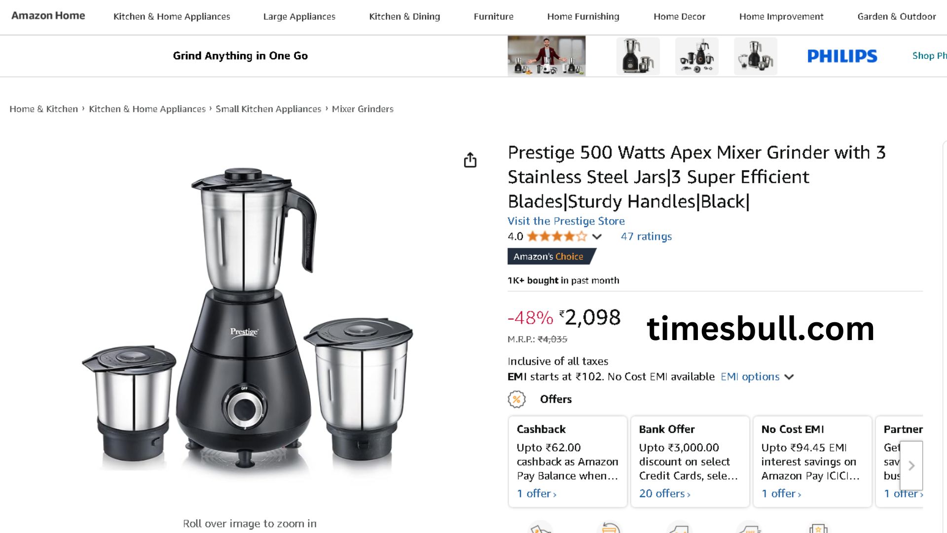 Both dry and wet grinding make extensive use of this 750-Watt Prestige Mixer Grinder. You can use it for a variety of purposes because it comes with three stainless steel and one juicer jar. Their blades are extremely sharp and effective. These best mixer grinders are also available with Amazon Deals at a 48% discount and with free EMI.