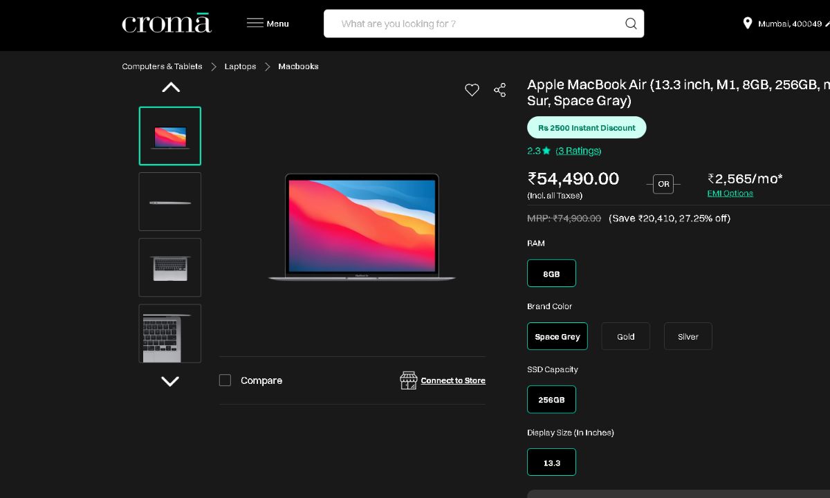 Croma is offering the MacBook Air, which has a 13.3-inch screen and Apple’s M1 CPU, for Rs 20,410 less. Its ultimate price drops to Rs ₹54,490 as a result. An EMI option of ₹2,565 per month is also available.