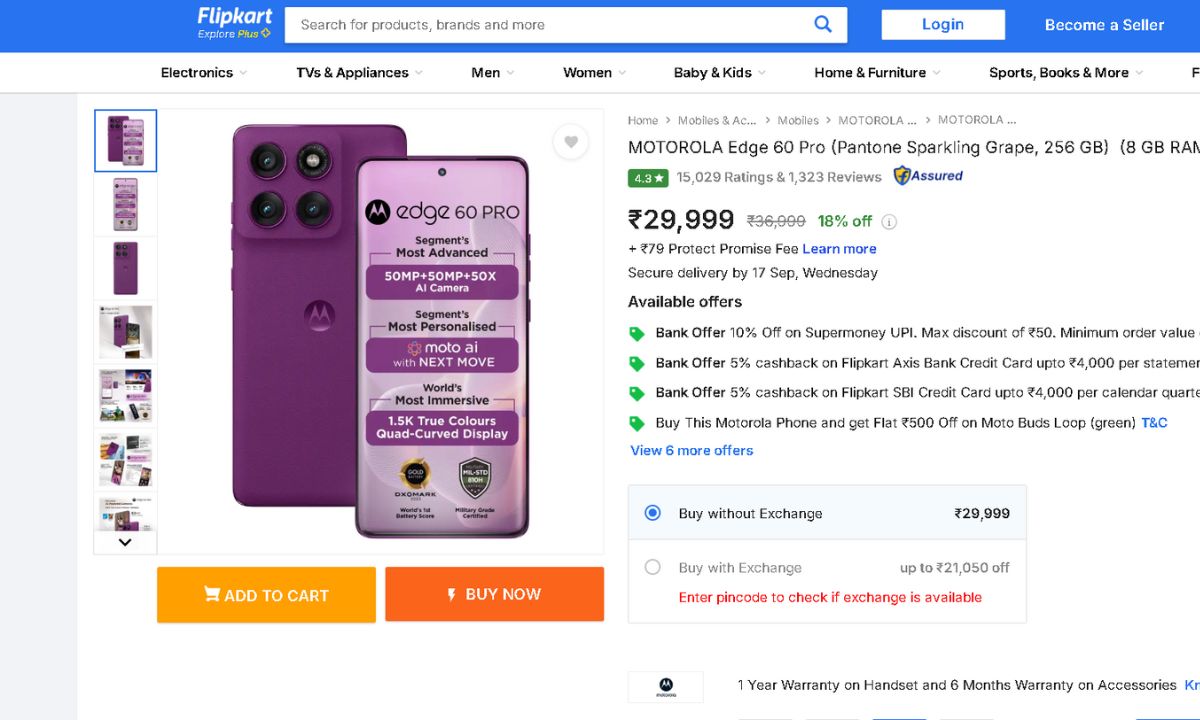 It is available for purchase at an initial price of Rs 24,999 during the Flipkart sale. When buying the phone, there will be a 5,000 rupee discount. It is listed by the corporation for Rs 7,000 less than its MRP. Up to Rs 12,000 can be saved in this manner. Penatone Dazzling Blue, Penatone Shadow, and Penatone Grape are the three color options available for this Motorola phone.