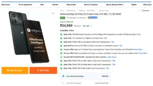 Motorola के इस स्मार्टफोन को फिलहाल 59,999 रुपये में लिस्ट किया गया है, फ्लिपकार्ट के मुताबिक, फोन की असल कीमत ₹64,999 है। यानी फोन पर 10 हजार रुपये तक का फ्लैट डिस्काउंट मिल रहा है। इसके बाद बैंक ऑफर्स भी है, जिसमें 5 हजार रुपये का एक्स्ट्रा डिस्काउंट मिल जायेगा।