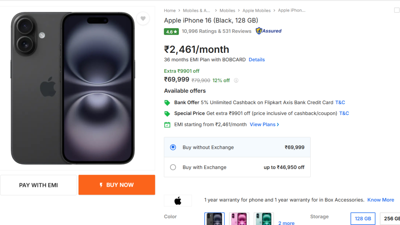 If you are paying with an SBI credit card, you receive a further ₹4,000 discount. If you are paying with a Flipkart Axis Bank credit card, you receive a further ₹3,350 discount. Both these offers combined can make iPhone 16 highly affordable.