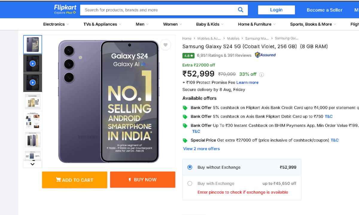 Flipkart’s price for the Samsung Galaxy S24 5G