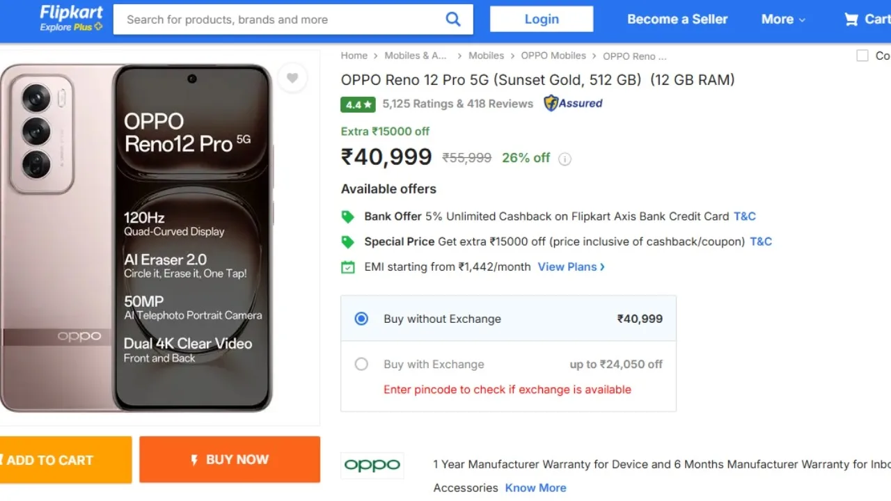If you were waiting for a massive deal, here is your chance. With flat discount, EMI plan, exchange bonus, and extra bank offer, this is one of the best phone deals currently available. Flipkart, take a look and take advantage of the OPPO Reno 12 Pro 5G before the deal runs out.