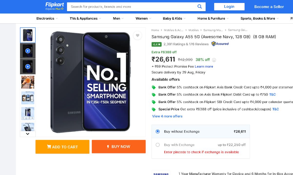 For Rs 39,999, the Samsung Galaxy A55 with 8GB RAM and 128GB of storage was launched in India. The current price of this smartphone is Rs 26,699 on Flipkart. This means the Galaxy A55 5G gadget is eligible for a flat discount of Rs 13,300 from the popular e-commerce site.