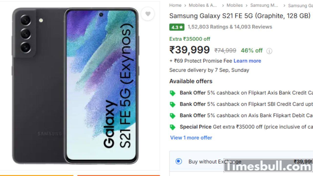 The original price of Samsung Galaxy S21 FE 5G was ₹74,999, but now it is getting a big discount of extra ₹35,000. Meaning now you can buy it for just ₹39,999. This is a tremendous price cut of almost 46%. With this discount, a premium flagship phone is now available at a mid-range price tag – a great money vasool deal!