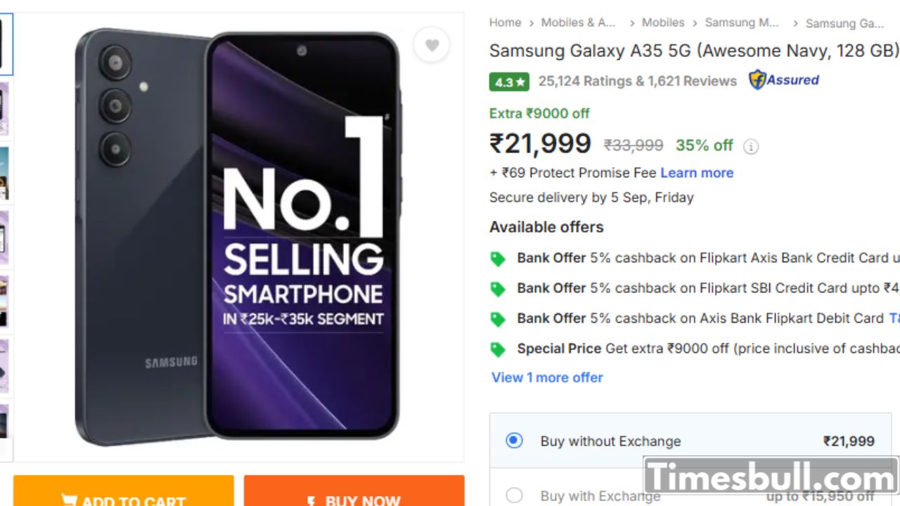 Samsung Galaxy A35 5G has now become even more affordable on Flipkart. This phone is available for just ₹21,999, down from its original price of ₹33,999, meaning a flat 35% discount! And if you have an exchange offer or bank offer, you can get it even cheaper. In a way, Samsung has taken full care to bring it within everyone’s budget.