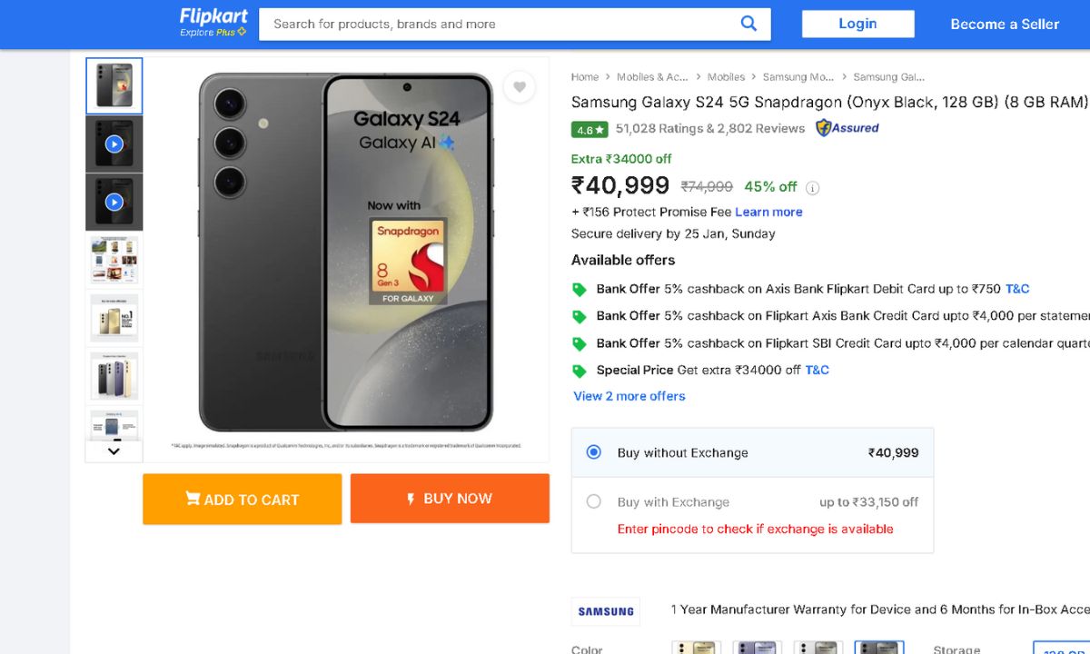 The 8GB+128GB storage version of the Samsung Galaxy S24 5G, which debuted at ₹74,999 last September, is now priced at ₹40,999 in the Flipkart sale. When using an Axis Bank Flipkart Debit Card to make purchases, you can receive a 5% cashback (up to ₹750), so lowers the effective price to ₹40,249. Also, giving in your current or old phone can save you up to ₹33,150. However, the type and condition of the gadget being turned in determine the exchange offer’s greatest benefit.